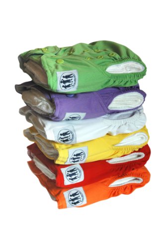 La taglia unica di tutti i pannolini pocket si adatta a tutte le forme e le misure tra i 3 ed i 13 kg. Morbidi e facili da lavare. (Tutti i pannolini vengono con 6 mesi di garanzia - vedere Descrizione del prodotto). Colori disponibili nel set: Rosso, Arancione, Verde, Giallo, Bianco e Viola (nuovo colore), 2 di ogni colore - ecco 12 pannolini e 24 inserti per set