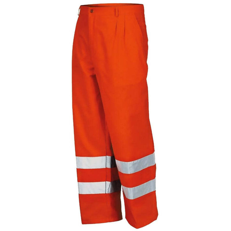 In 60% cotone, 40% poliestere, peso 350 gr/mq fustagno. Bande retroriflettenti. Con 1 tasca posteriore con bottone, 1 tasca portametro, 2 tasche anteriori a filetto. Chiusura patta con bottoni coperti. A norma UNI EN ISO 13688:2013 - 20471:2013.