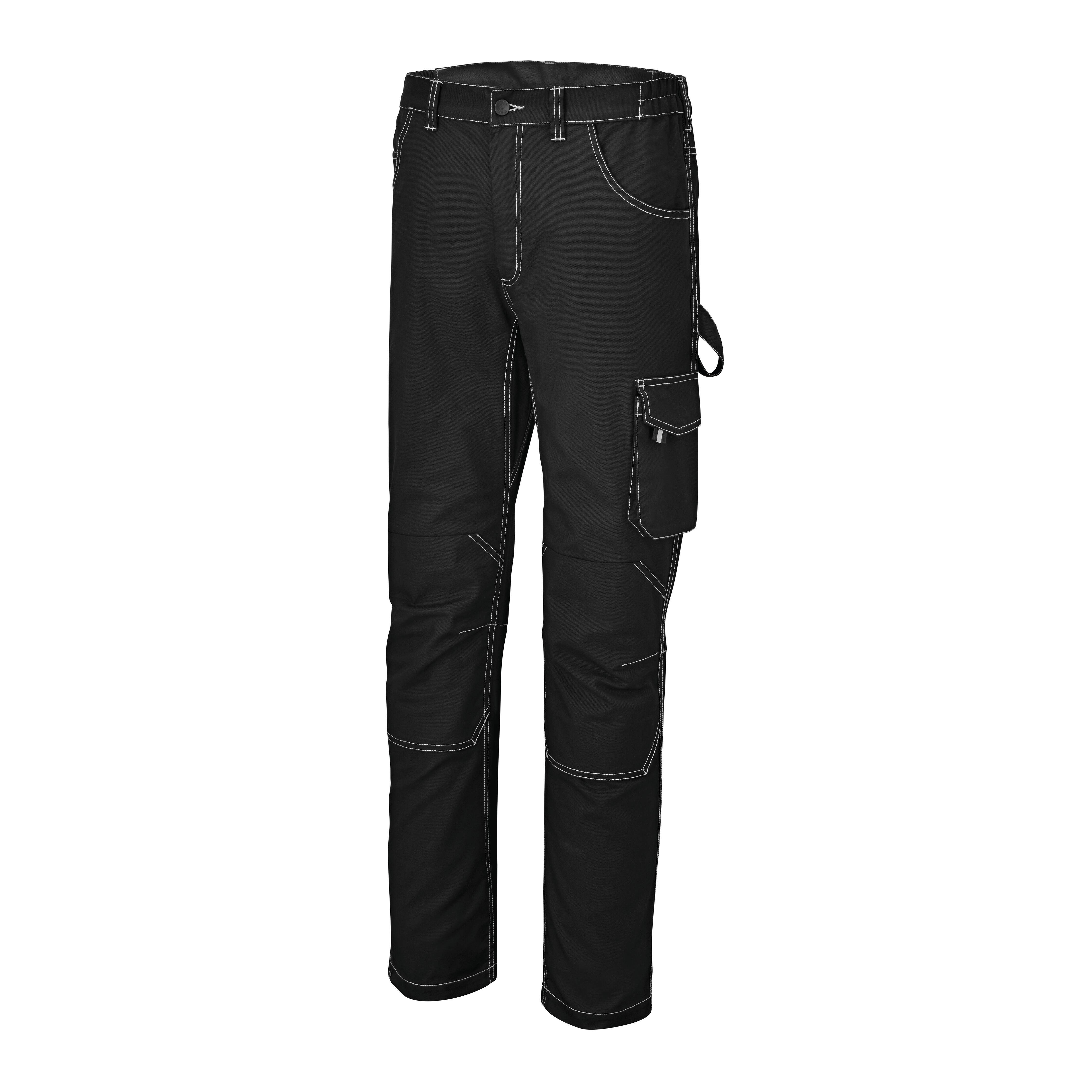 In T/C Canvas 290g elasticizzato nero, con tascone laterale, chiusura con cerniera. Slim Fit con cavallo antistrappo e vita elasticizzata ai lati. Due ampie tasche anteriori, di cui una con taschino, due tasche posteriori con chiusura a strappo. Tascone laterale sinistro con chiusura a strappo, dotato di inserto portabadge e tasca porta metro e fascia porta martello. Con inserti porta ginocchiere