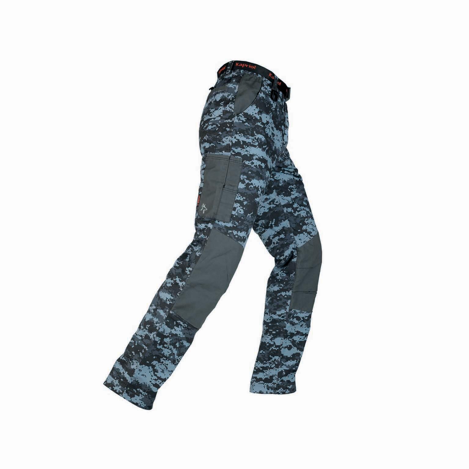 In cotone grigio, completo di tasche laterali, chiusura con cerniera e patta con bottoni. Multitasca