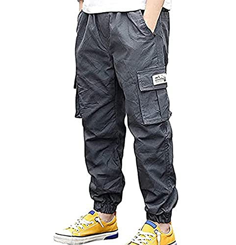 Pantaloni cargo per ragazzi e bambini, pantaloni da jogging con tasche multiple, in cotone, pantaloni sportivi per primavera, autunno, inverno, elasticizzati, in vita (grigio, 175 cm)