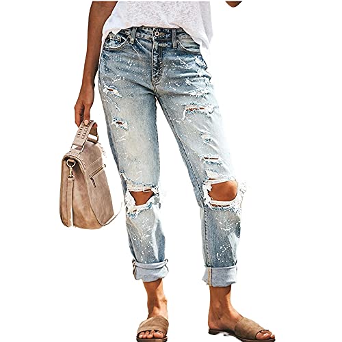 NP NP Pantaloni da Donna Elasticizzati in Denim Stile Strada Dritto con Foro Lavabile, Azzurro Chiaro, M