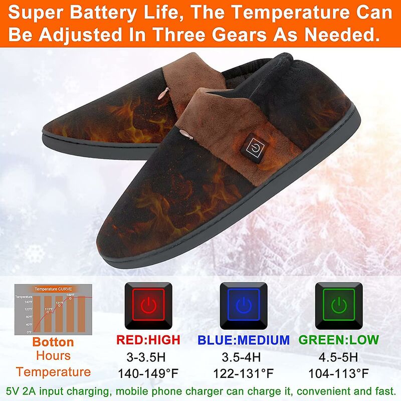 Sistema di riscaldamento efficiente Questa scarpa riscaldante adotta un'avanzata tecnologia di riscaldamento in fibra di carbonio, che ha un elevato tasso di conversione dell'energia termica e un risparmio energetico. I cuscinetti riscaldanti superiore e inferiore riscaldano allo stesso tempo la pianta del piede e il collo del piede. L'elemento riscaldante in fibra di carbonio può migliorare la circolazione del calore del sangue dei tuoi piedi e svolgere un ruolo nel mantenere caldo e analgesico. Temperatura regolabile e durata della batteria sicura e di lunga durata Le pantofole riscaldate per uomo donna possono essere controllate dall'interruttore di regolazione della temperatura intelligente. Con una batteria al litio polimerica ad alte prestazioni da 4000 mAh, può durare fino a 5 ore e High Gear 2,5-3 ore, Medium Gear 4 ore. Inoltre, la tensione di lavoro di 5 V è molto inferiore alla tensione di sicurezza di 36 V per il corpo umano, quindi non devi preoccuparti di ricevere una