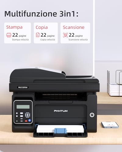 PANTUM M6558NW Stampante Laser Multifunzione bianco e nero, WIFI Monocromatica 3 in 1 stampa, copia e scansione, Wireless con ADF, Velocità di stampa fino a 22 ppm Fogli per Ufficio