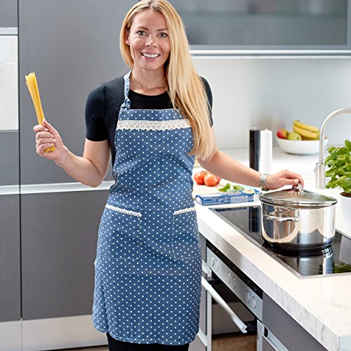Pink Papaya Grembiule, Grembiule da Cuoco in 100% Lino di Cotone, Grembiule da Cucina Laura, Colore: Blu/Bianco con Puntini e Applicazioni in Pizzo...