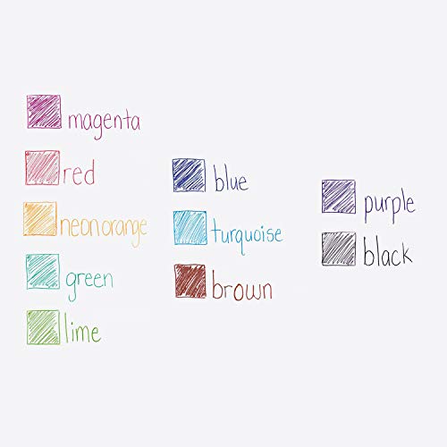 Questo set contiene dieci penne nei colori: rosso, arancione fluo, lime, verde, turchese, blu, rosa, viola, marrone e nero.
