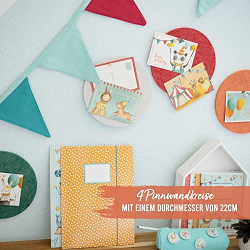 Divertimento colorato: in questo set riceverete 4 lavagne autoadesive in feltro con 6 cartoline e 12 puntine in legno per fissare i biglietti ai cerchi in feltro. In questo modo potrete creare una decorazione colorata per la cameretta dei bambini