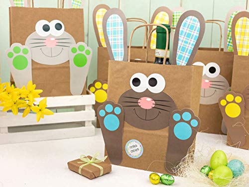 Riceverai 6 sacchetti di carta extra large per piccoli oggetti più grandi: in carta kraft marrone (22,5 x 18 x 8cm), 12 adesivi per gli occhi e 6 pagine DIN A4 pre-tagliate con dolci Easter Bunny giallo blu verde - (cartone per il fai da te da 300 g) per una facile rimozione