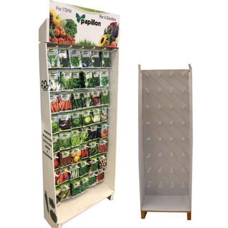 ESPOSITORE CARTONE 48 GANCI SEMI ORTO PAPILLON L. x P. x H.: 76x26x181,5 cm. Espositore in cartone per sementi per orto in bustina - 48 ganci