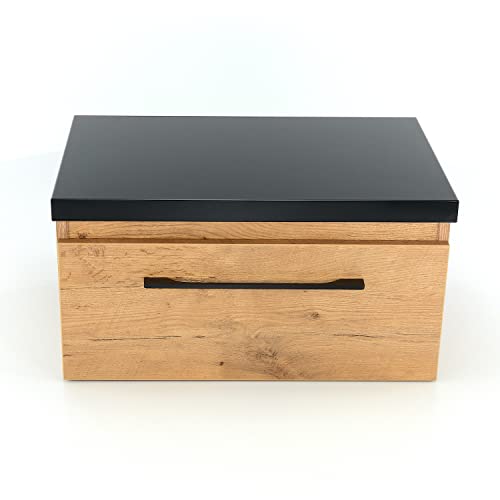 Armadietto da bagno sospeso con cassettiera frontale in stile rovere, ripiano superiore nero con maniglie in metallo nero (320 mm)