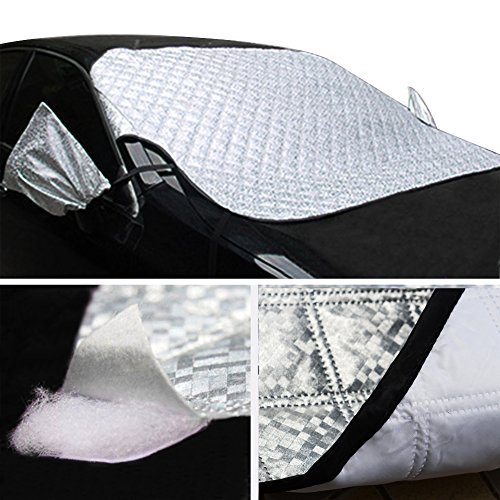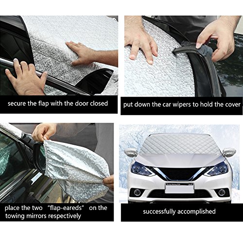 Facile da applicare - ci vogliono solo un paio di minuti per aprire il vostro parabrezza Cover tutto il vostro parabrezza anteriore. fissarlo con l' applicazione della bungee cinghie per le ruote. Il manto nevoso lembi vicino all' interno dell' auto porte per garantire una vestibilità sicura al parabrezza per bloccare efficacemente il vento così mai mosche via e previene il furto