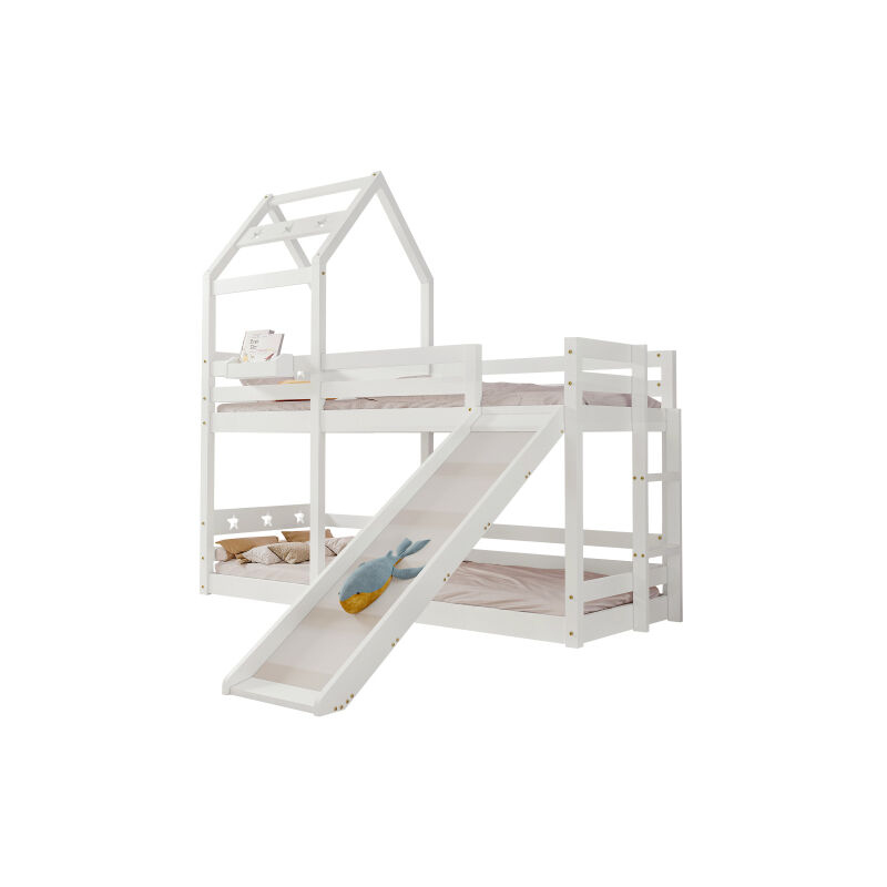 Caratteristiche del prodotto Cotto divertente con diapositiva e scaffale: grazie alla diapositiva annessa, tuo figlio può alzarsi dal letto o scivolare fuori dal solito modo sopra la scala in costruzione! Alzarsi la mattina diventa il gioco di bambini quando è così divertente alzarsi dal letto. C'è uno scaffale aggiuntivo per la lettura del letto sul letto. La cornice bianca si adatta a ogni arredamento: questo robusto lettino in cabina in pino in bianco fresco migliora immediatamente ogni stanza e la modernizza. La sua costruzione è perfetta per i bambini più piccoli, in particolare il letto inferiore, in cui i piccoli possono facilmente rotolare dentro e fuori. EN 747-1: 2012+A1: 2015 Certificazione: la sicurezza dei tuoi piccoli è la nostra priorità. Tutti i letti a castello sono testati in base ai più alti standard. Profondità massima del materasso: 13 cm Sviluppato per la sicurezza di tuo figlio: questo letto progettato artisticamente è progettato in modo tale da sopravvivere