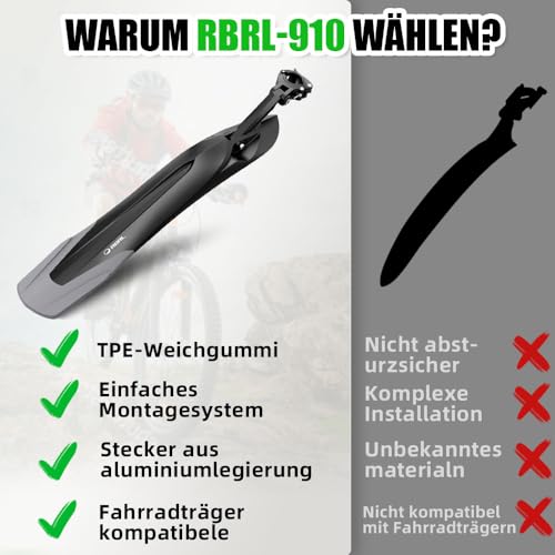 Materiale durevole: parafango per bicicletta RBRL realizzato in plastica ad alte prestazioni con resistenza agli urti, al gelo e protezione dell'ambiente. La parte posteriore è realizzata in morbida gomma TPE ad alta resistenza. Il design dell'assorbimento degli urti non si rompe in caso di collisione.