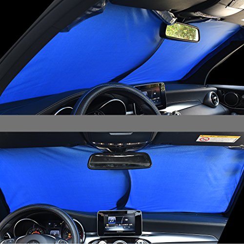 Materiale di alta qualità: il paraluce è realizzato in filo di ferro duttile ad alta resistenza e materiale in tessuto Oxford resistente, impermeabile e ad alta densità. Il materiale in tessuto ha uno strato argentato su un lato per proteggere dal sole. Può bloccare il 98% dei raggi UV, mentre l'elegante rivestimento blu da un lato dà una sensazione di freschezza.