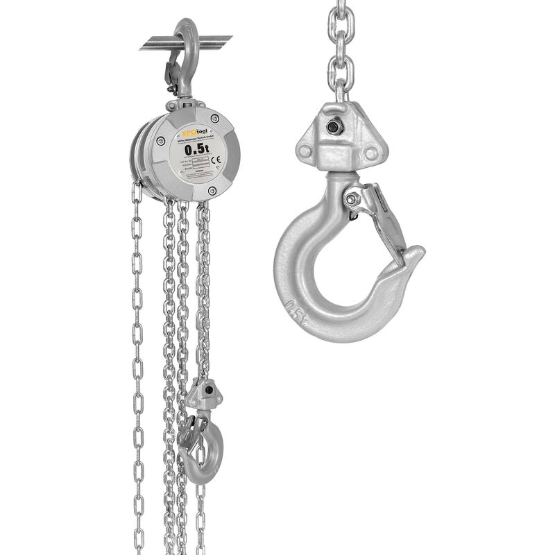 Paranco manuale a catena per il sollevamento e l'abbassamento di carichi Realizzato in alluminio resistente e antiruggine Due anelli di catena con 3,2 m di lunghezza, 3 m di altezza di sollevamento e 500 kg di portata. Orientabile a 360° con catena manuale liberamente azionabile e sistema frenante Carrucola mobile a bassa manutenzione e leggera (4,5 kg) Un paranco a catena viene utilizzato per sollevare e abbassare in verticale i carichi. La grande trasmissione di forza del paranco consente di spostare carichi pesanti con poco sforzo. Il paranco a catena XPOtool è manuale, quindi il movimento di sollevamento è generato solo dalla forza umana. Nonostante una capacità di carico fino a 500 kg, il paranco ha una struttura semplice. È composto da un'unità di sollevamento con alloggiamento, catena manuale, catena di sollevamento e gancio. Tutte le parti sono realizzate in alluminio resistente e antiruggine. Le catene hanno una lunghezza di 3,2 m e un'altezza di sollevamento di 3 m. Tirando