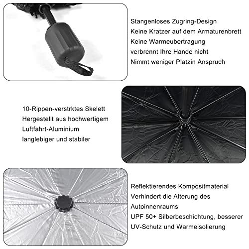 【Facile da Piegare e Conservare】 Questo coprisole auto parabrezza interno è una volta chiuso è estremamente compatto, esattamente come un comune ombrello. L'apertura a forma di ombrello del parasole auto copre l'intero vetro del finestrino anteriore della vostra auto quando è aperto, è possibile rendere il parasole si adatta perfettamente al parabrezza in pochi secondi senza utilizzare ventose o adesivi.
