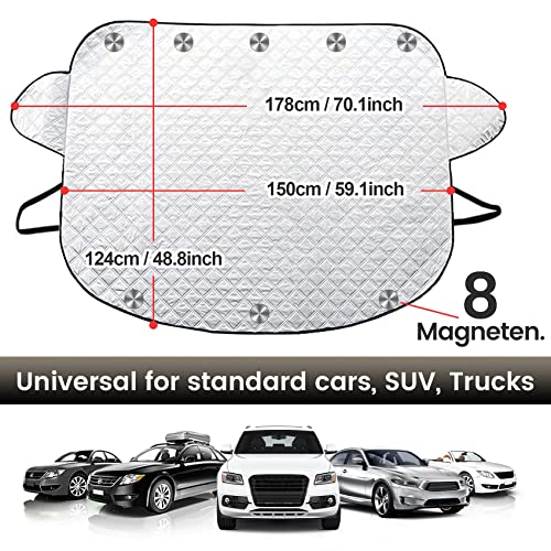 【FORTE E DUREVOLE】Copri Parabrezza per Auto 8 pezzi di magneti contenuti nel materiale, non graffiare la superficie dell'auto, più vantaggi e praticità rispetto alla maggior parte della ventosa della copertura parabrezza auto fissata con il tergicristallo. La nostra copertina del parabrezza ha due orecchie piccole, devi solo avvolgere le due orecchie nella porta chiusa per completare l'installazione.