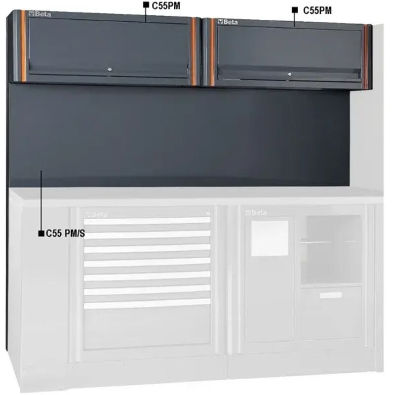 Parete con pensili per arredo officina. Tipologia: Parete Modello: Racing system rsc55 Utilizzo: Arredo officina Composizione: Beta c55pm(x2) + c55 pm/s Struttura: Portante fornita Dimensione pensili: 1024x400x300 mm Dimensione pannello: 2050x620 mm Sistema di apertura: Molle a gas Predisposizione: Pannelli forati beta c55 2pf Colore: Grigio racing Articoli correlati: Beta c55b - c55b-pro Peso: 80 kg