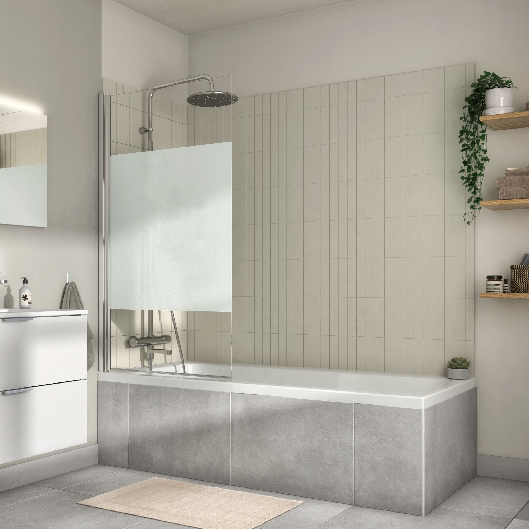 Parete vasca Essential in vetro di sicurezza 5 mm serigrafato H 140 cm. "ideale per case con un unico bagno con vasca è Facile e veloce da pulire, Non richiede opere murarie complesse, Ottima durata nel tempo. Ideale in presenza di bambini e anziani. ". "La parete vasca riduce gli spruzzi d'acqua sul pavimento durante l'utilizzo È l'accessorio ideale per trasformare facilmente la vasca da bagno in una doccia e soddisfare le esigenze di tutta la famiglia"