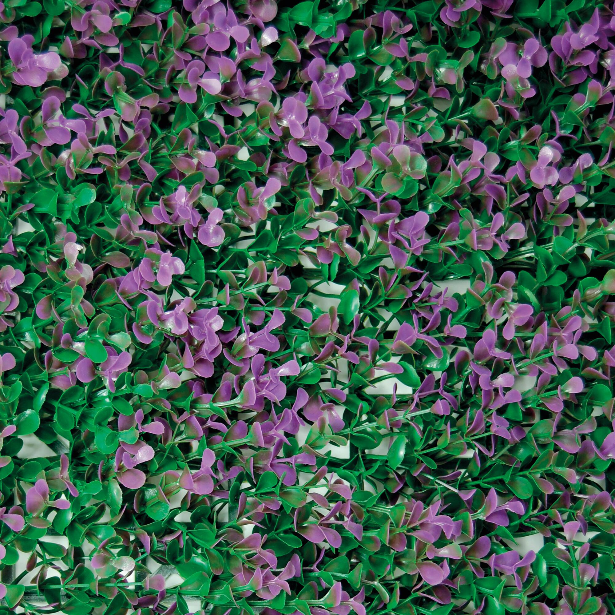 Pannello componibile con foglie tipo bosso lilla 0,5x1 m Foglie 3D molto realistiche in polietilene. Struttura di supporto: griglia in plastica. Semplice da unire ad altri pannelli. Per interni ed esterni.. Indicato per esterni ed interni, per piccoli e grandi spazi, per schermare e decorare;