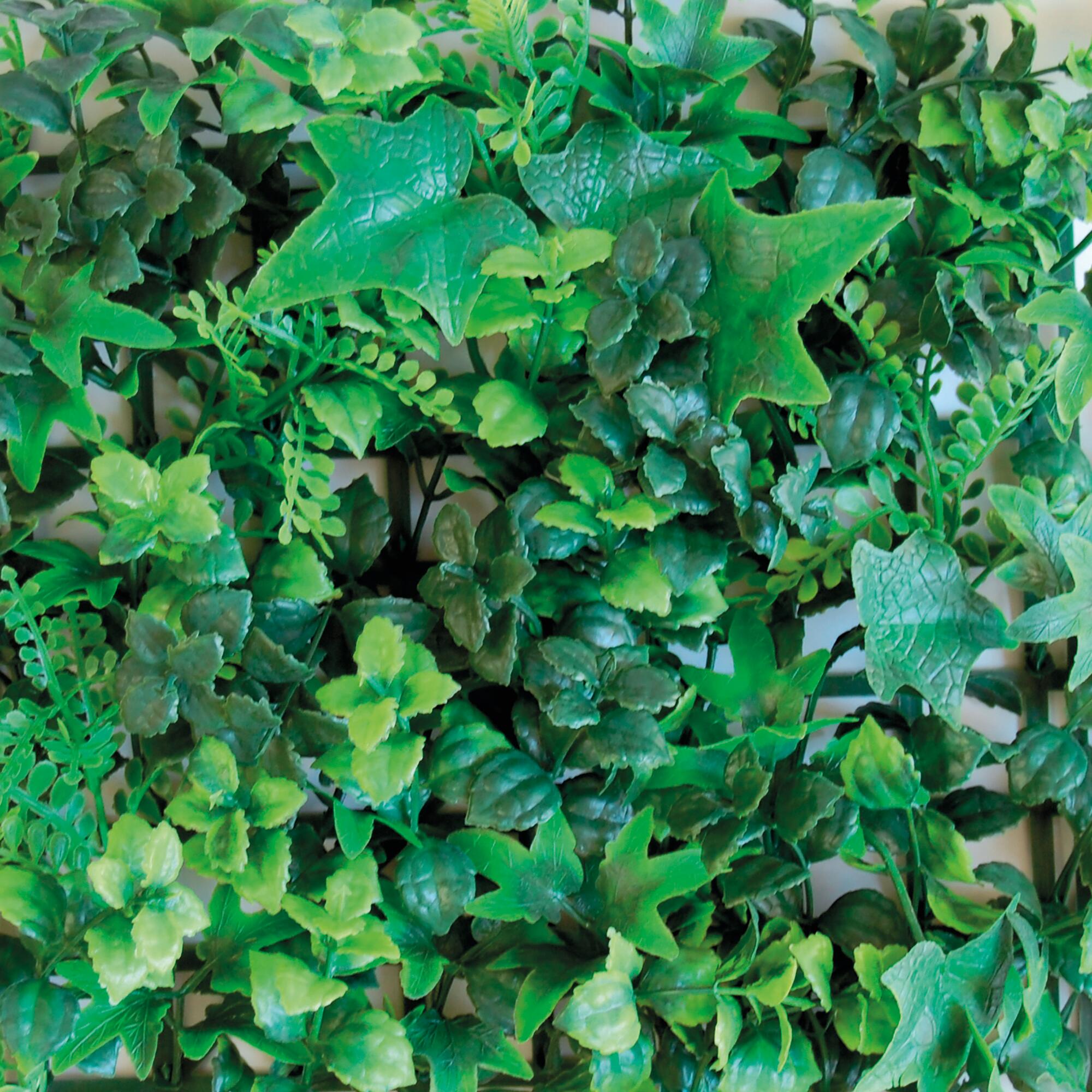 ideale anche per la schermatura frangivista di balconi e terrazze.. Altamente decorativo, è perfetto per creare pareti verdi di grande effetto e giardini verticali.. Foglie altamente verosimiglianti che riproducono l'aspetto e il colore delle foglie naturali. Realizzate in polietilene, risultano piene e rigogliose, belle da vedere da tutte le angolazioni.. Le foglie sono sostenute da una griglia in plastica, facilmente agganciabile ad altri moduli per ottenere la misura desiderata. Si possono combinare pannelli con diverse tipologie di foglie per creare composizioni originali.. Trattate per resistere ai raggi UV, non si scoloriscono e mantengono le caratteristiche inalterate nel tempo.