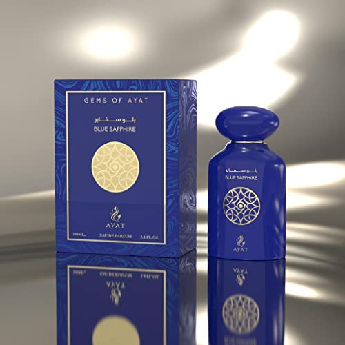 Eau de Parfum Gems of Ayat - Blue Sapphire, 100 ml, di Ayat Perfume, profumo arabico per uomini e donne, oud orientale, realizzato e creato a Dubai. Note: arancia, cuoio, zafferano e lavanda.
