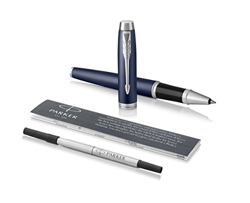 PARKER IM Penna Roller, Punta Fine e Ricarica di Inchiostro Nero, Matte Blue Chrome Trim + Ricarica per Penna Roller, Punta Media, Confezione da 2 Pezzi, Blu
