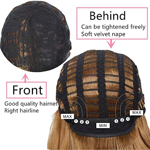 Due cinturini di regolazione possono essere intrecciati in una posizione fissa e possono essere regolati in base a diverse dimensioni della testa.Parrucche economiche e di buona qualità.Cuffia parrucca è morbido e traspirante per evitare di stimolare il cuoio capelluto