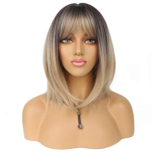 Parrucca corta Bob con frangia bionda ombre lunghezza spalla dritta parrucca sintetica per donne resistente al calore per feste e uso quotidiano