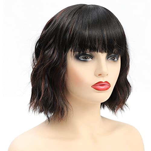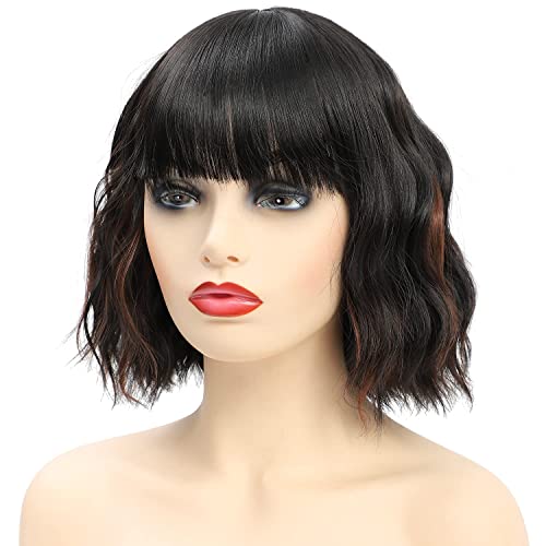 Parrucca corta ondulata, parrucca sintetica ondulata riccia nera per parrucca da donna in fibra resistente al calore con frangia naturale
