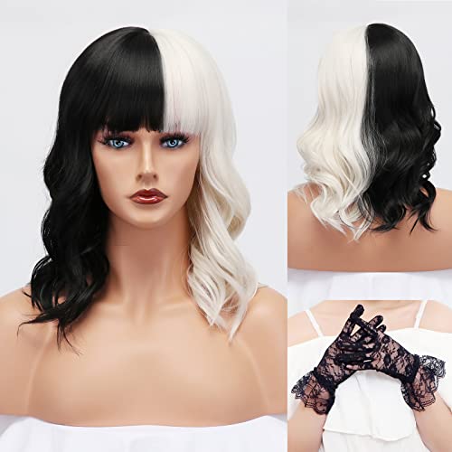 Parrucca da crociera bianca e nera lunga 34 cm con lunghezza delle spalle ondulata corta da donna con botto completo resistente al calore parrucca con cappuccio