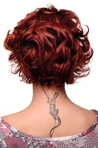 Impressionante parrucca dai capelli corti, voluminosa e cotonata, con onde che vanno dalla riga fino alle punte, in un mix di castano scuro e nuances rosse. Codice colore: 4T30. Lunghezza: circa 30 cm.
