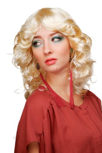 Parrucca biondo chiaro, capelli ondulati leggermente ricci con riga in mezzo per Carnevale e Halloween.