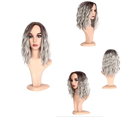 Parrucca da donna, colore grigio-argento sfumato con radici nere, alla moda, ondulata, resistente al calore, fibre sintetiche, con cuffia da 35,6 cm