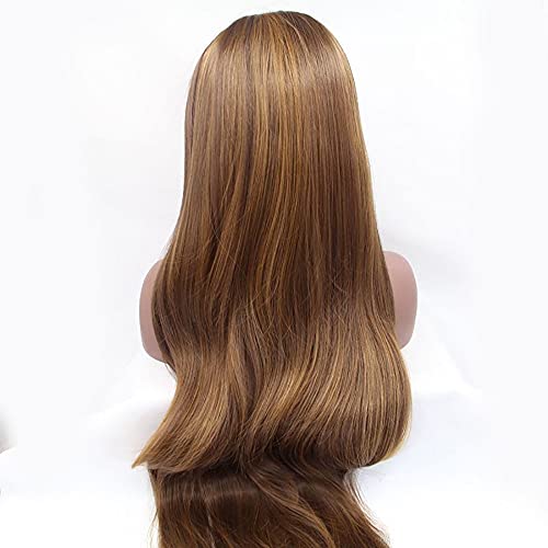 Parrucca da donna in fibra sintetica con retina frontale, 61 cm, colore castano chiaro, con densità 180%, riga centrale, legata a mano, resistente al calore