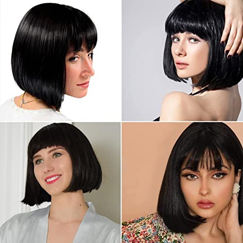 Black Bob Wig with Bangs Short Black Wig Bob Human Hair Wig New Natural Short Straight Wigs Flat Fringe Wigs Heat Resistant Synthetic Wigs for Party