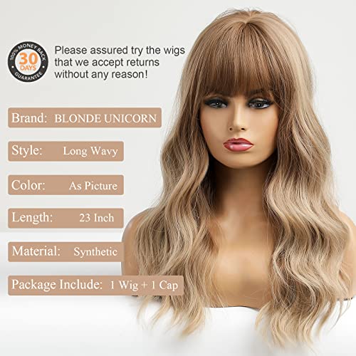 Parrucca ondulata lunga da marrone a biondo con frangia BLONDE UNICORN Parrucche sintetiche lunghe ondulate e ricci per le donne...