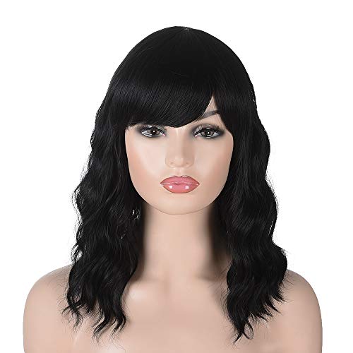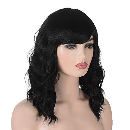 Parrucca Bob di ricambio per ragazze in fibra resistente al calore con frangia intera, lunghezza spalla Morticia (Nera)