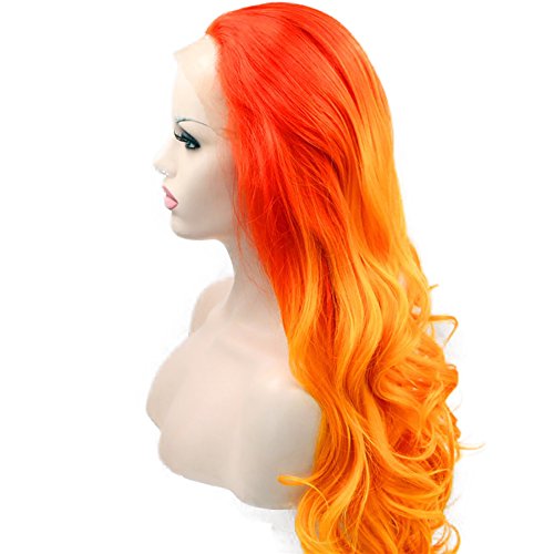 Parrucca sintetica da donna, 61 cm, con radici rosse e riflessi arancioni, con punte arancioni e riga libera, con pizzo frontale, densità 180%, resistente al calore