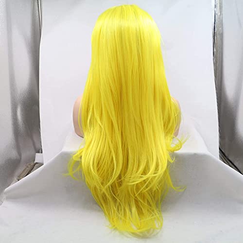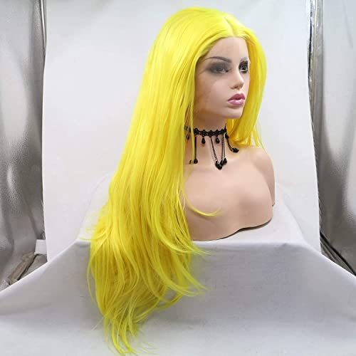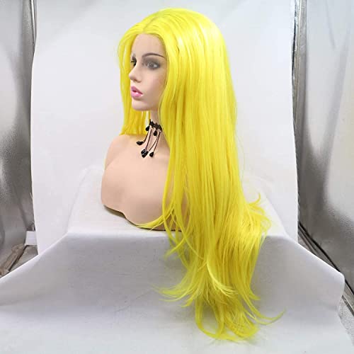 Parrucca sintetica gialla con pizzo frontale, parrucca di ricambio per donne, resistente al calore, per cosplay, uso quotidiano, aspetto naturale (61 cm, giallo / pizzo anteriore)