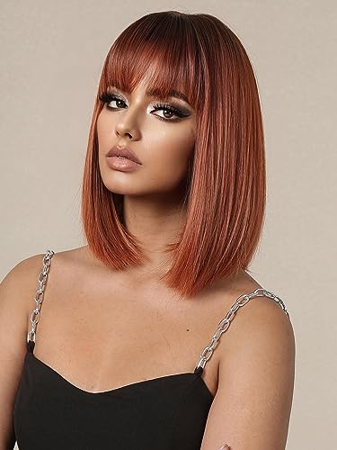 Parrucche Corte Lisce Bob Ombre Rosso Ramato con Frangetta per Donna, Parrucca Radici Scure da 14'' Capelli Resistenti al Calore per Cosplay Festa Quotidiana