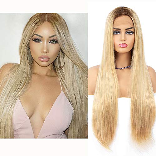 Parrucche Jisheng Ombre Bionde Pizzo Anteriore, Radici Marrone Chiaro Parrucche lunghe diritte Parrucca sintetica Ricambio capelli sintetici Ombre 2 Tone per Donna