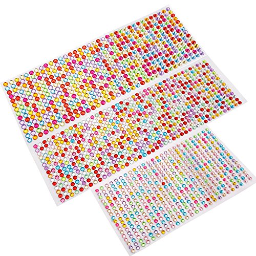 Confezione da 1699 pezzi di strass luminosi e multicolore, autoadesivo, suddivisi in 4 fogli, con 775 pezzi da 3 mm, 408 pezzi da 4 mm, 300 pezzi da 5 mm, 216 pezzi da 6 mm, ogni dimensione disponibile in diversi colori. Materiale: lussuoso strass acrilico.