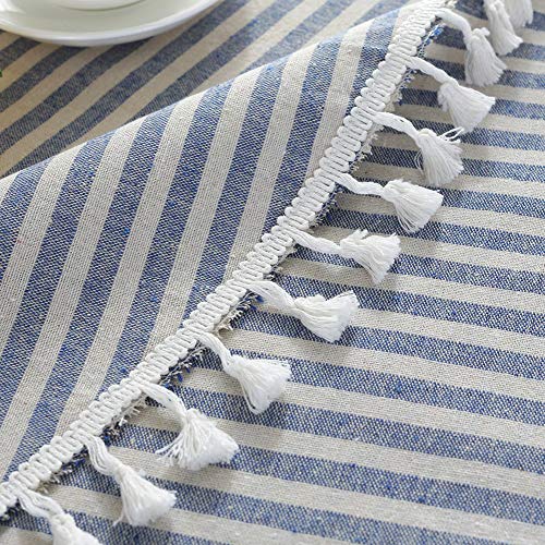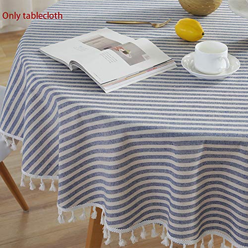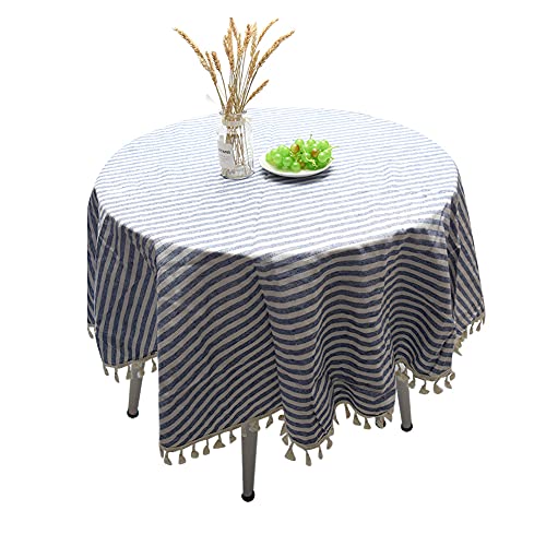 Parthan 150 cm Tovaglia Rotonda - Tovaglia in Cotone e Lino Tovaglie semplici in Righe, con Nappa - Tovaglietta Adatta per la Decorazione della Cucina Domestica(Blu)