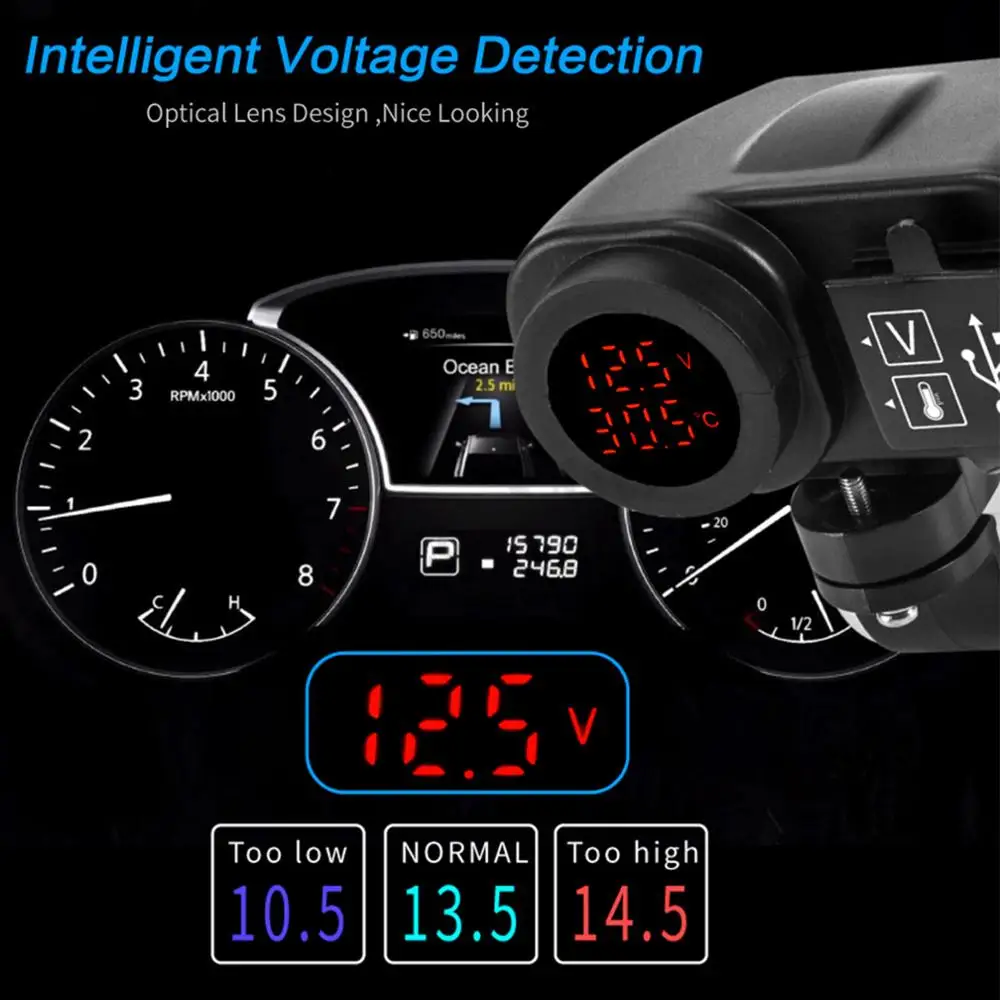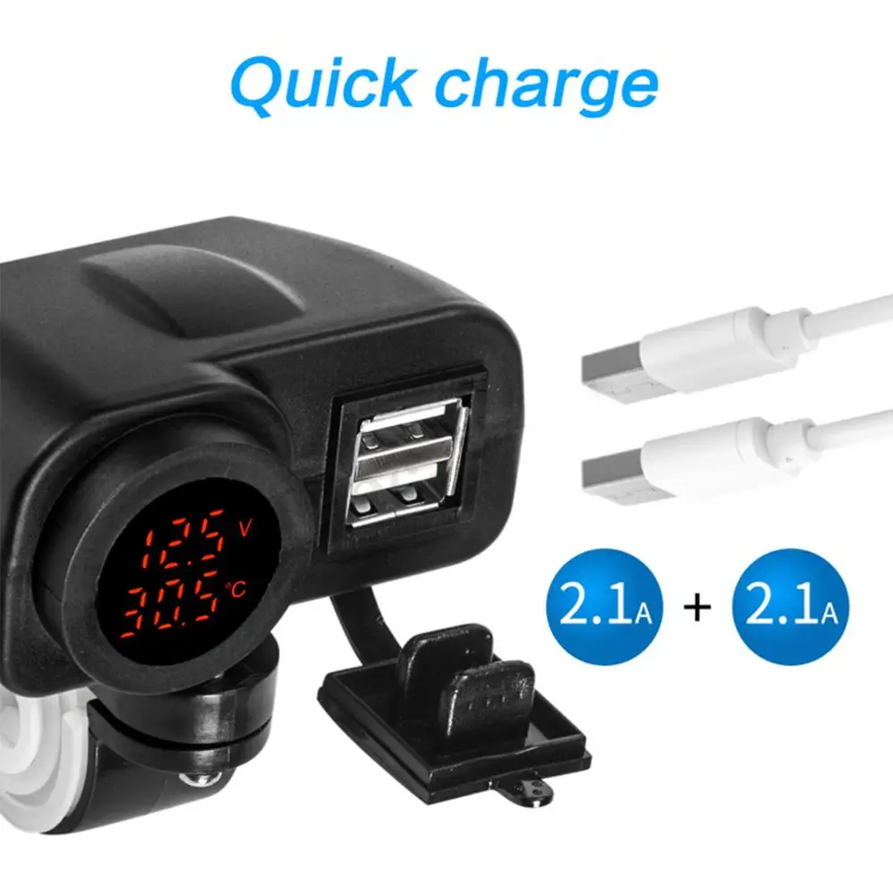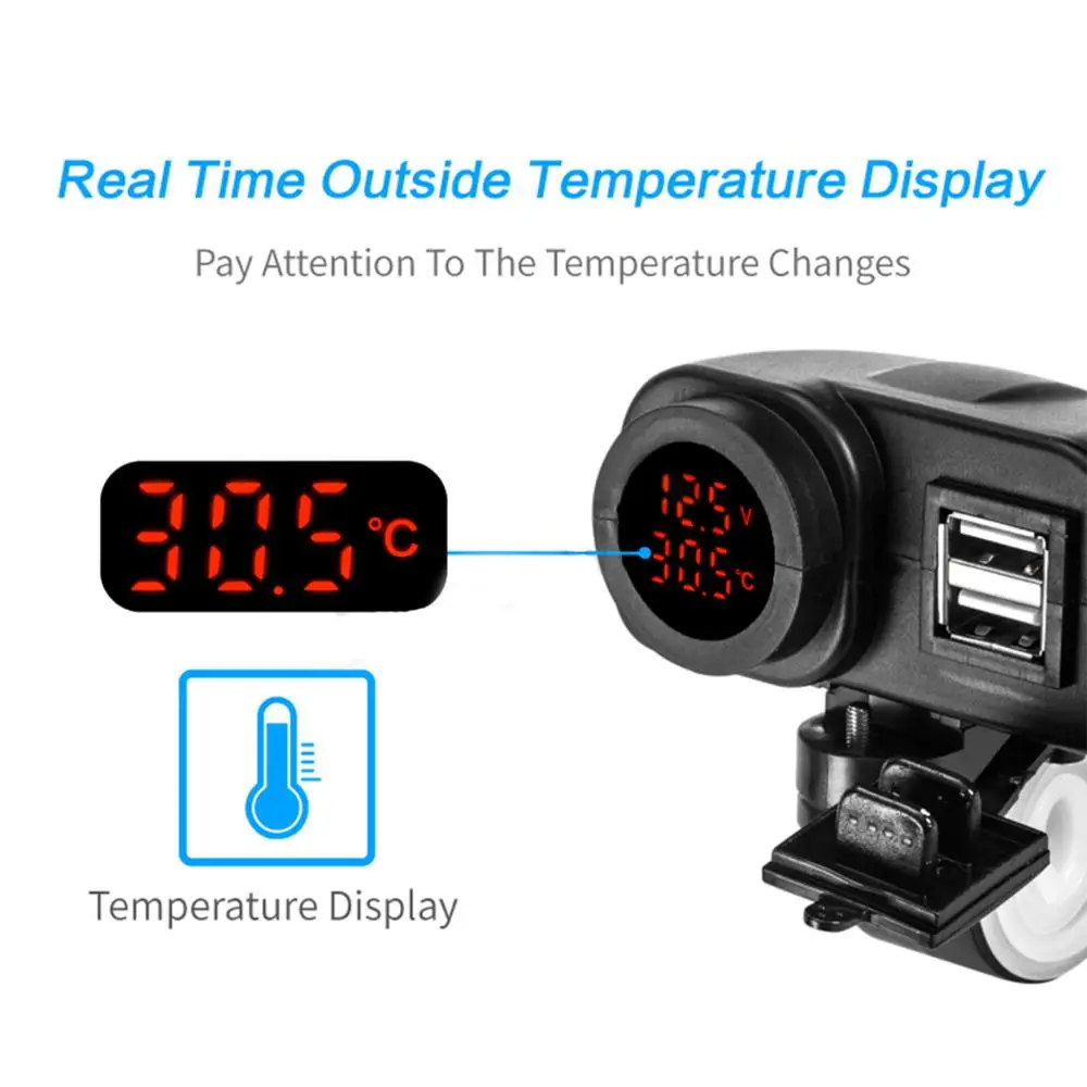 Partol Multifunction Motorcycle USB Charger LED Digital Voltmeter Thermometer 2.1A+2.1 For Charging GPS iPhone iPod PSP Phones