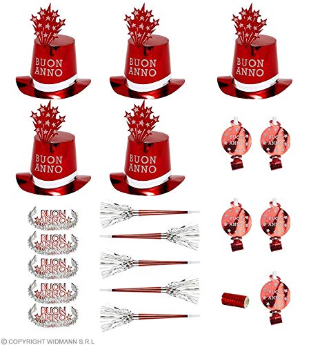 Il pacchetto di Capodanno è composto da 5 cappelli da festa, 5 corone, 5 trombe, 5 trombette con valvola d'aria e una confezione di stelle filanti. I colori brillanti argento e rosso conferiscono agli accessori un tocco glamour. La scritta "Buon Anno", che significa in tedesco "Frohes New Jahr", farà felice soprattutto agli ospiti italiani