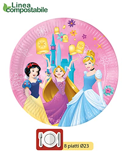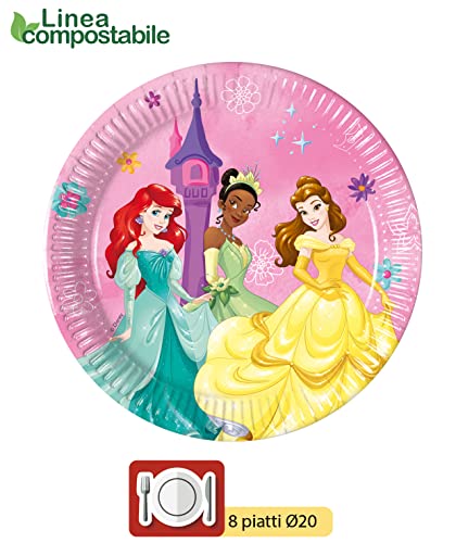 Kit Party Tavola Disney Princess Live Your Story per 8 persone (44 pezzi: 8 piatti carta Ø23cm, 8 piatti carta Ø20cm, 8 bicchieri plastica 200ml, 20 tovaglioli carta 33x33cm)