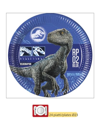 Kit Party Tavola Jurassic World 2 per 24 persone (88 pezzi: 24 piatti carta Ø23cm, 24 bicchieri plastica 200ml, 40 tovaglioli carta 33x33cm)