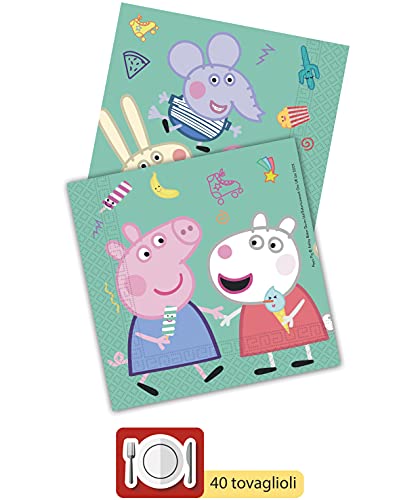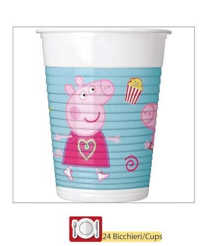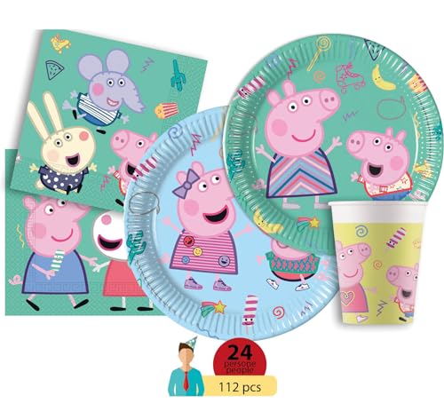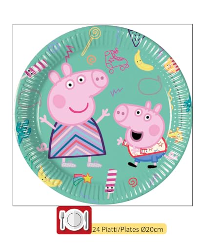 Kit Party Tavola Peppa Pig Messy Play per 24 persone (112 pezzi: 24 piatti carta Ø23cm, 24 piatti carta Ø20cm, 24 bicchieri carta 200ml, 40 tovaglioli carta 33x33cm)