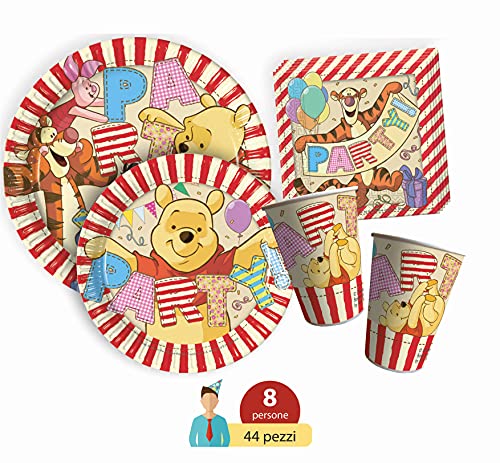 Kit Party Tavola Winnie The Pooh Alphabet per 8 persone (44 pezzi: 8 piatti carta Ø23cm, 8 piatti carta Ø20cm, 8 bicchieri plastica 200ml, 20 tovaglioli carta 33x33cm)